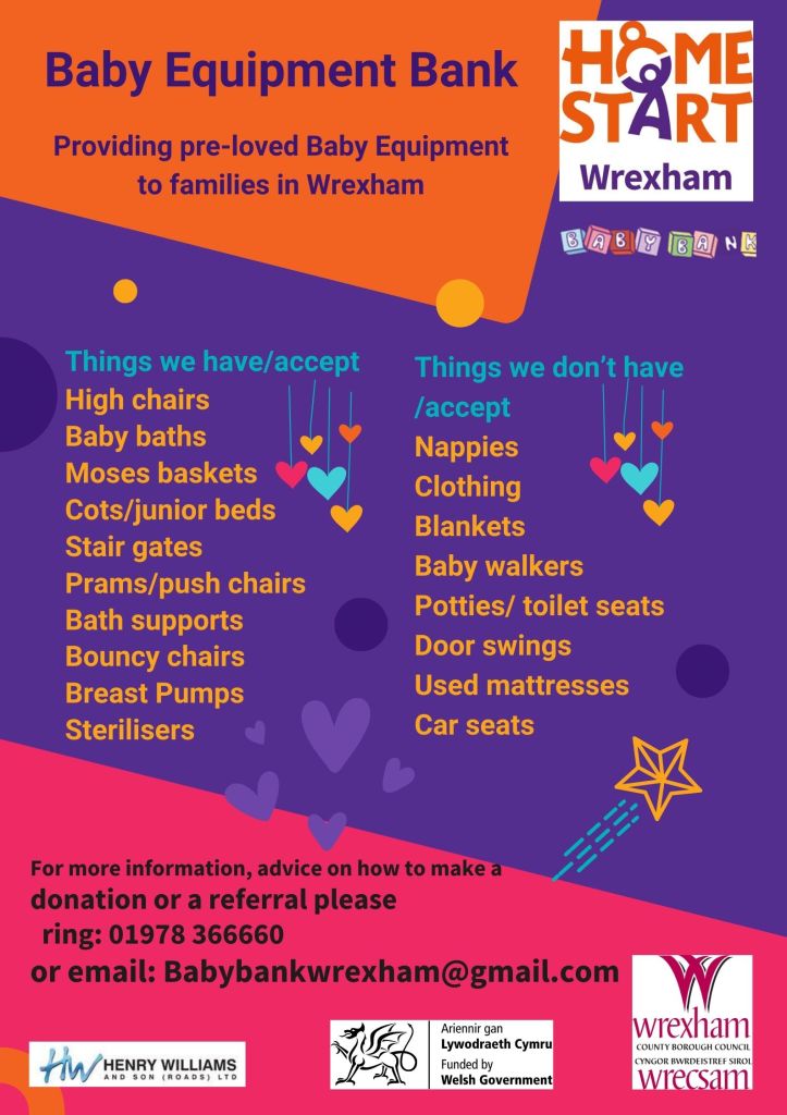 Baby Equipment Bank is a small project run by Home-Start, providing pre-loved baby equipment to families in Wrexham.